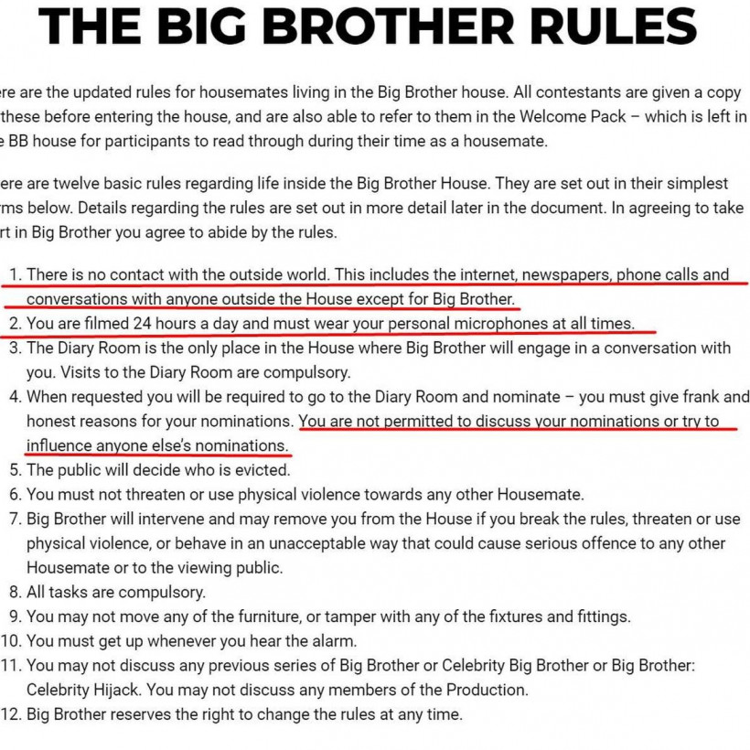 Θυμίζουμε πως οι κανόνες στο Big Brother είναι ίδιοι σε όλες τις χώρες που παίζεται το παιχνίδι. Όπως είδατε παραπάνω, τουλάχιστον δυο από τους κανονισμούς που ισχύουν στο πασίγνωστο ριάλιτι, έχουν παραβιαστεί...