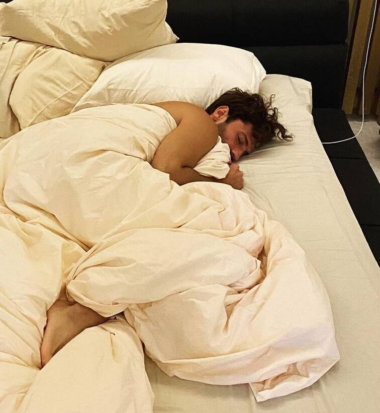 Στην φωτογραφία φαίνεται ο ίδιος να κοιμάται ημίγυμνος κάτω από τα μπεζ του σκεπάσματα. Ο τραγουδιστής έγραψε από κάτω: «Σε φόρτιση... μέχρι να βγειι το καινούργιο μας τραγούδι σε λίγές μέρες».