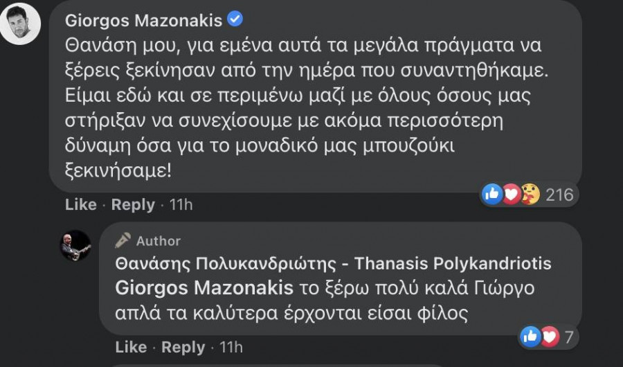 Στα σχόλια της ανάρτησής του, σχολίασε και ο Γιώργος Μαζωνάκης, ο οποίος τόνισε πως είναι εδώ και τον περιμένει να συνεχίσουν δυναμικά.
