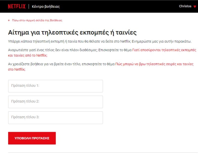 Αν θέλετε λοιπόν να κάνετε τη δική σας πρόταση, δεν έχετε παρά να πάτε στην επιλογή «Κέντρο Βοήθειας» που βρίσκεται στο εικονίδιο του λογαριασμού σας. Στη σελίδα που θα ανοίξετε, θα πάτε στην επιλογή «Αίτημα για τηλεοπτικές ταινίες ή εκπομπές». Εκεί θα βρεθείτε στο παρακάτω πεδίο…