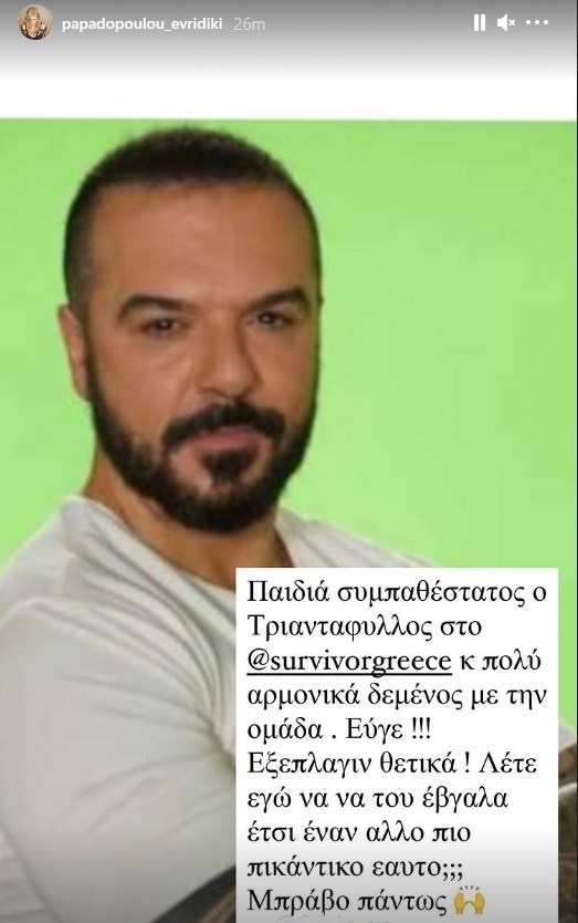 Όλα αυτά φαίνεται πως αποτελούν παρελθόν, με την ξανθιά καλλονή να ανεβάζει ένα story στον προσωπικό της λογαριασμό στο Instagram την ώρα που παιζόταν το Survivor. Αυτή τη φορά, η Ευρυδίκη Παπαδοπούλου αναφέρθξκε με κολακευτικά λόγια στον τραγουδιστή. Δείτε την ανάρτησή της...