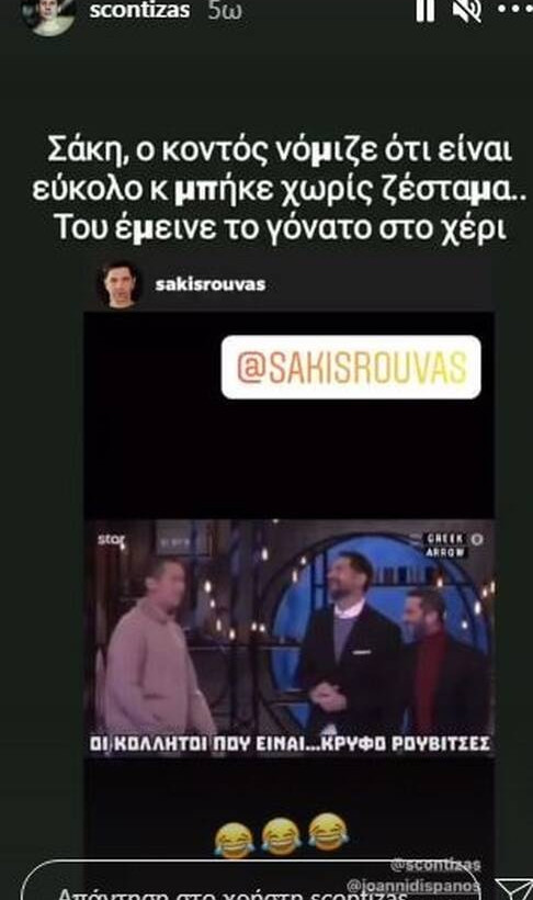 Την ανάρτηση του Σάκη Ρουβά δεν άφησαν ασχολίαστη ο Λεωνίδας Κουτσόπουλος και ο Σωτήρης Κοντίζας με story στους δικούς τους λογαριασμούς στο Instagram.