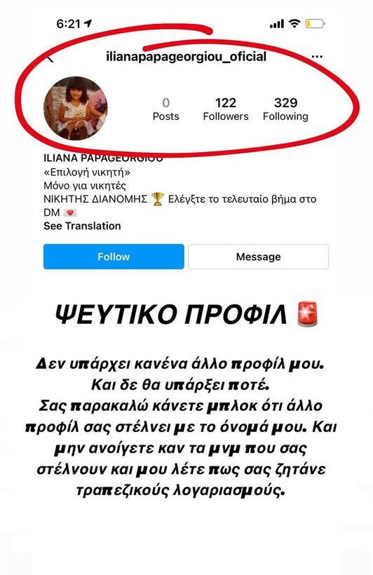 Θύμα διαδικτυακής απάτης έπεσε για ακόμα μια φορά η Ηλιάνα Παπαγεωργίου καθώς ανακάλυψε ψεύτικα προφίλ που χρησιμοποιούν το όνομα και τις φωτογραφίες της, με σκοπό να πείσουν ανυποψίαστους χρήστες του Instagram να τους δώσουν τα στοιχεία τους με σκοπό την υποκλοπή.