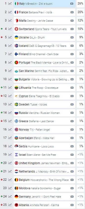 Το δεύτερο φαβορί, σύμφωνα πάντα με τα στοιχήματα, Γαλλία θα εμφανιστεί 20η, ενώ… πιο άτυχη ήταν η Μάλτα, την οποία θα δούμε 6η.