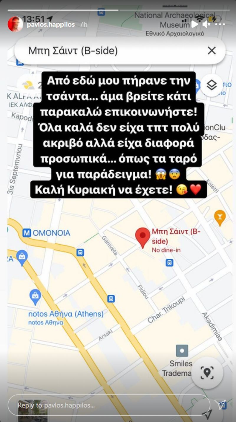 Μάλιστα, ο παίκτης του Masterchef δημοσίευσε και χάρτη με το σημείο στο οποίο έγινε η κλοπή της τσάντας του…
