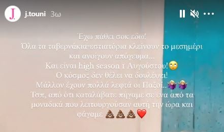 Συγκεκριμένα έγραψε: «Έχω πάθει σοκ εδώ! Όλα τα ταβερνάκια-εστιατόρια κλείνουν το μεσημέρι και ανοίγουν το απόγευμα... Και είναι high season 1 Αυγούστου! Ο κόσμος δεν θέλει να δουλέψει! Μάλλον έχουν πολλά λεφτά οι Παξοί... Τσπ, από ότι καταλάβατε πήγαμε σε ένα από τα μοναδικά που λειτουργούν αυτή την ώρα και φάγαμε».