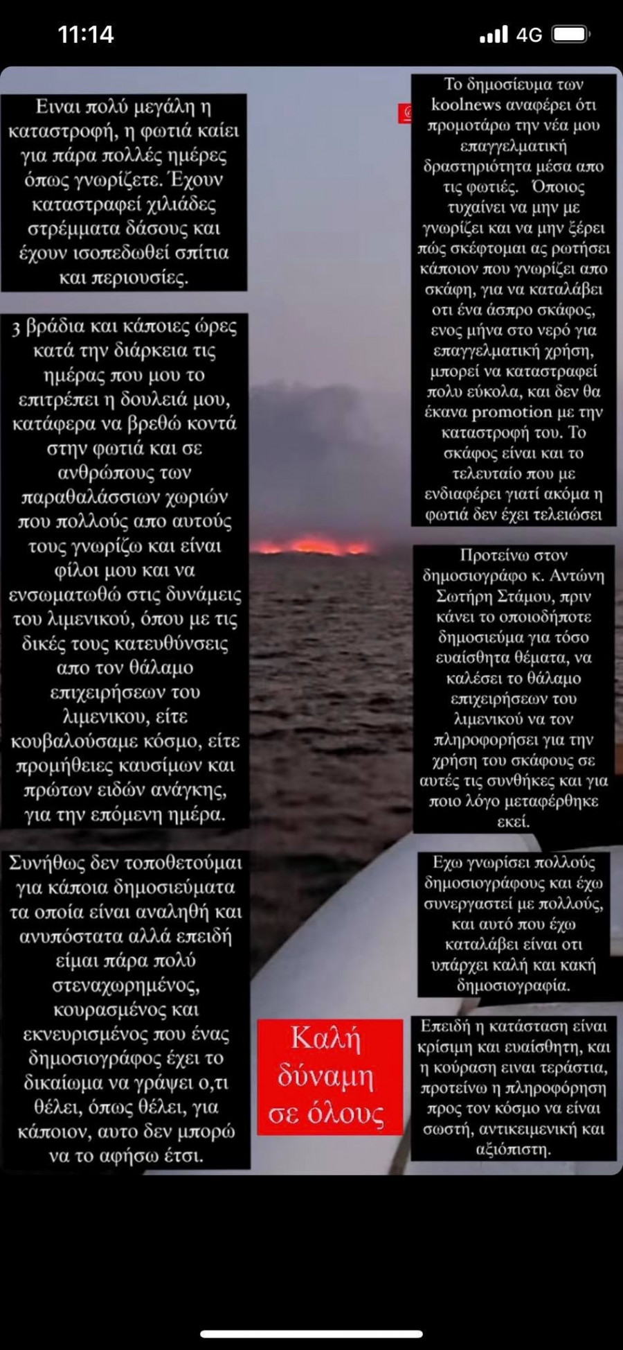 «Όποιος τυχαίνει να μη με γνωρίζει και να μην ξέρει πώς σκέφτομαι, ας ρωτήσει κάποιον που ξέρει από σκάφη, για να καταλάβει ότι ένα άσπρο σκάφος ενός μήνα στο νερό για επαγγελματική χρήση, μπορεί να καταστραφεί πολύ εύκολα και δεν θα έκανα promotion με την καταστροφή του. Το σκάφος είναι και το τελευταίο που με ενδιαφέρει, γιατί ακόμα η φωτιά δεν έχει τελειώσει», έγραψε, μεταξύ άλλων ο Γιώργος Αγγελόπουλος.