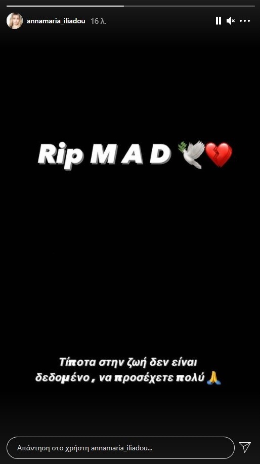 Λίγες ώρες μετά το σοκαριστικό τροχαίο που στοίχισε τη ζωή στον Mad Clip, η σύντροφό του, Άννα Μαρία Ηλιάδου έκανε την πρώτη της ανάρτηση στο Instagram.