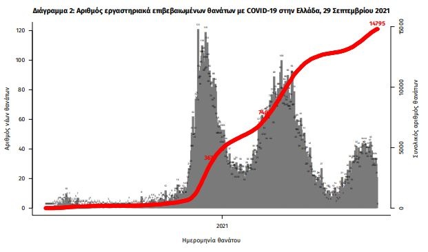 Οι νέοι θάνατοι ασθενών με COVID-19 είναι 44, ενώ από την έναρξη της επιδημίας έχουν καταγραφεί συνολικά 14.795 θάνατοι. Το 95.4% είχε υποκείμενο νόσημα ή/και ηλικία 70 ετών και άνω.