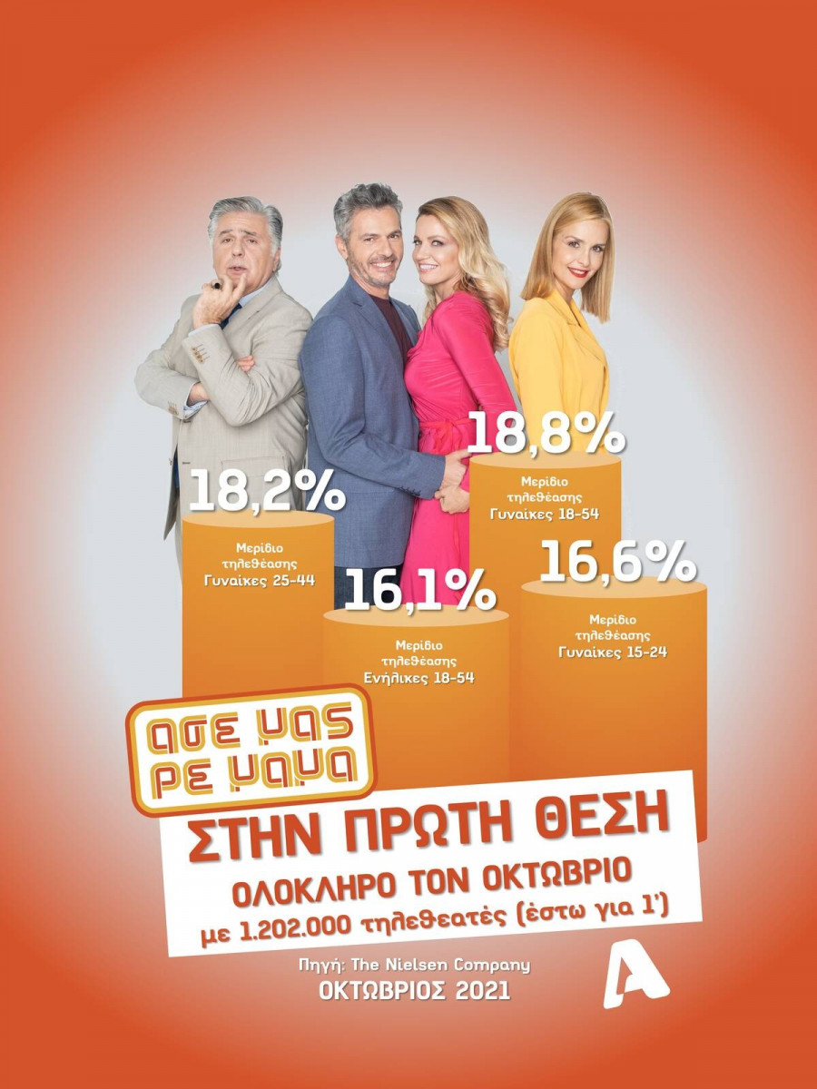 Η οικογενειακή κωμική σειρά «Άσε μας ρε μαμά», άφησε πίσω τον ανταγωνισμό και τερμάτισε πρώτη και τον Οκτώβριο στο δυναμικό κοινό 18-54 με ποσοστό 16,1% και με 1.202.000 τηλεθεατές να την παρακολουθούν έστω και για 1 λεπτό.