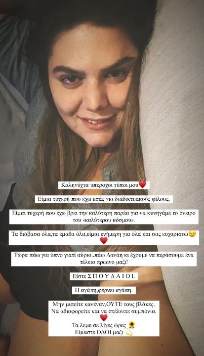 «Καληνύχτα υπέροχοι τύποι μου. Είμαι τυχερή που έχω εσάς για διαδικτυακούς φίλους. Είμαι τυχερή που έχω βρει την καλύτερη παρέα για να κυνηγάμε το όνειρο του “καλύτερου κόσμου”. Τα διάβασα όλα, τα έμαθα όλα, είμαι ενήμερη για όλα και σας ευχαριστώ. Τώρα πάω για ύπνο γιατί αύριο...πάω Δανάη κι έχουμε να περάσουμε ένα τέλειο πρωινό μαζί. Είστε σπουδαίοι. Η αγάπη, φέρνει αγάπη. Μην μισείτε κανέναν, ούτε τους βλάκες. Να αδιαφορείτε και να στέλνετε συμπόνια. Τα λέμε σε λίγες ώρες. Είμαστε όλοι μαζί», έγραψε η Δανάη Μπάρκα.