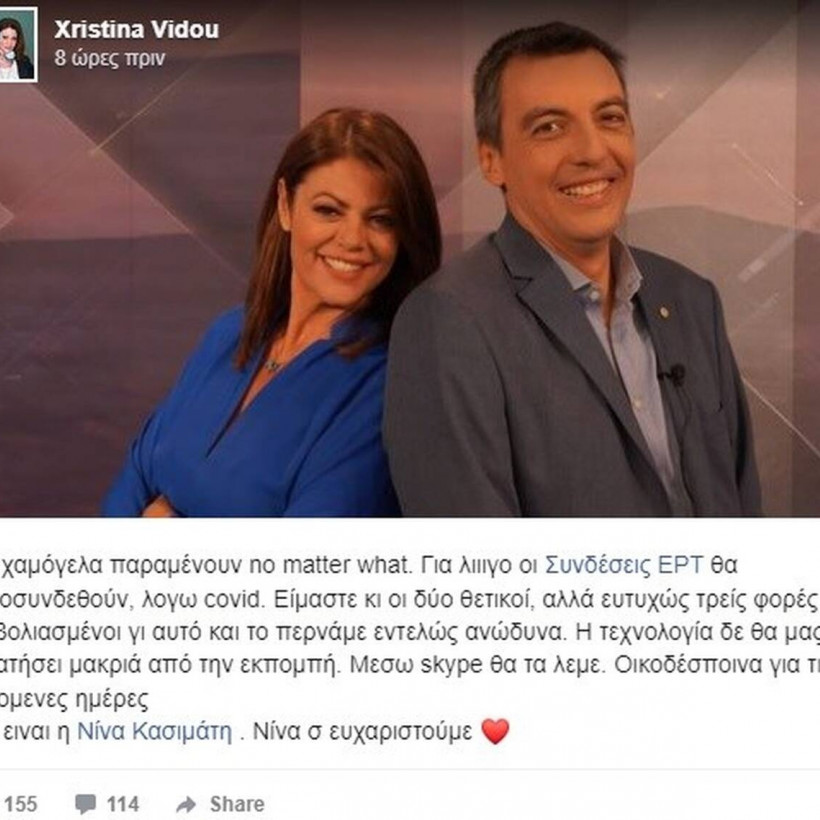 Η Χριστίνα Βίδου, στη δική της ανάρτηση, έγραψε: «Τα χαμόγελα παραμένουν no matter what. Για λίγο οι Συνδέσεις ΕΡΤ θα αποσυνδεθούν, λόγω covid. Είμαστε κι οι δύο θετικοί, αλλά ευτυχώς τρείς φορές εμβολιασμένοι γι' αυτό και το περνάμε εντελώς ανώδυνα. Η τεχνολογία δε θα μας κρατήσει μακριά από την εκπομπή. Μέσω skype θα τα λέμε. Οικοδέσποινα για τις επόμενες ημέρες θα είναι η Νίνα Κασιμάτη. Νίνα σ' ευχαριστούμε».