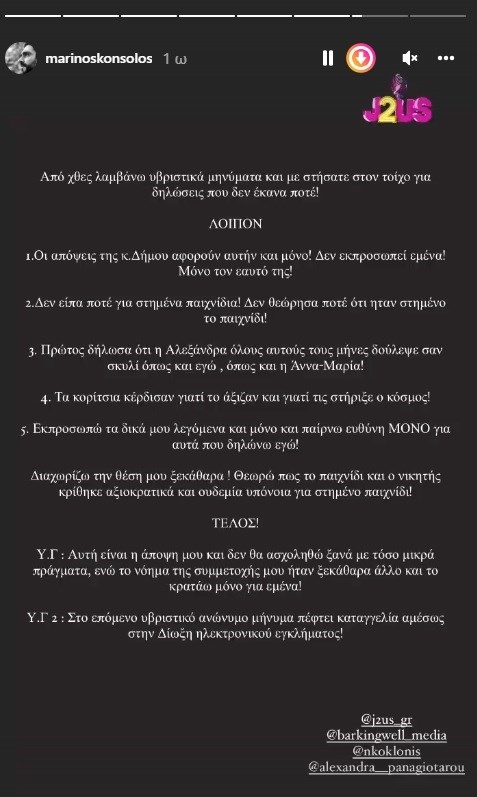 J2US: Η ανάρτηση - απάντηση του Μαρίνου Κόνσολου μετά τα υβριστικά μηνύματα που δέχεται