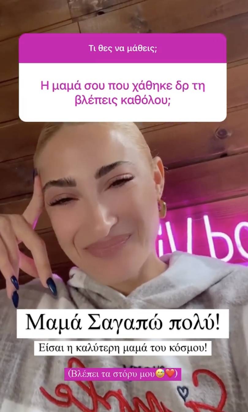 Επίσης, έγραψε πάνω στο story της: «Μαμά σε αγαπάω πολύ! Είσαι η καλύτερη μαμά του κόσμου. Βλέπει τα στόρυ μου».