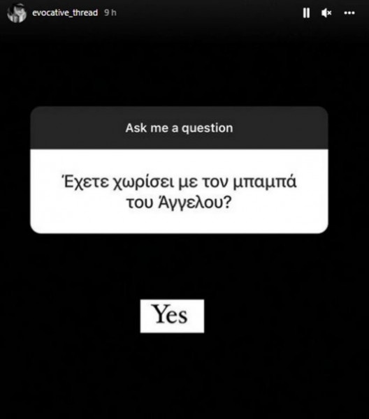 Σε ένα από τα τελευταία της Instagram stories, η Ελένη Αϊβαλή απάντησε στις ερωτήσεις των followers της. Ανάμεσα στα όσα τη ρωτούσαν ήταν και αν έχει χωρίσει με τον πατέρα του Άγγελου και εκείνη απάντησε καταφατικά.