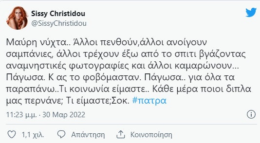 «Μαύρη νύχτα.. Άλλοι πενθούν, άλλοι ανοίγουν σαμπάνιες, άλλοι τρέχουν έξω από το σπίτι βγάζοντας αναμνηστικές φωτογραφίες και άλλοι καμαρώνουν… Πάγωσα. Κ ας το φοβόμασταν. Πάγωσα.. για όλα τα παραπάνω.. Τι κοινωνία είμαστε.. Κάθε μέρα ποιοι δίπλα μας περνάνε; Τι είμαστε; Σοκ», έγραψε η ίδια στον προσωπικό της λογαριασμό στο twitter.