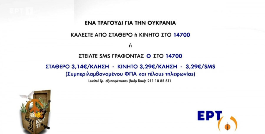 Με ένα ξεχωριστό «Μουσικό Κουτί» σήμερα, Δευτέρα 4 Απριλίου, στις 10 το βράδυ, η ΕΡΤ, με τη συμμετοχή 40 καλλιτεχνών που θα τραγουδήσουν, πραγματοποιεί τηλεμαραθώνιο αλληλεγγύης, «Ένα τραγούδι για την Ουκρανία», με σκοπό τη συγκέντρωση χρημάτων για τους άμαχους και τους πρόσφυγες της Ουκρανίας. Τα χρήματα που θα συγκεντρωθούν, θα προσφερθούν μέσω του Ελληνικού Ερυθρού Σταυρού για την ενίσχυση των πληγέντων.