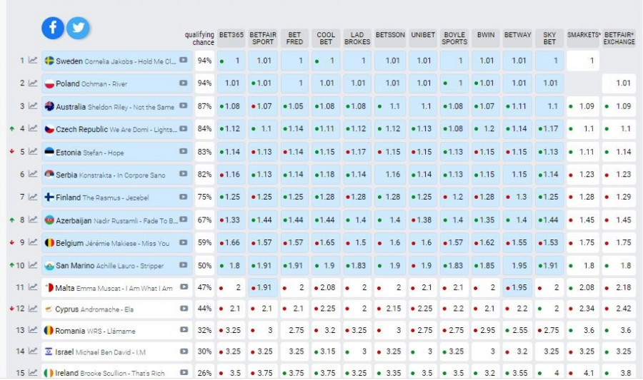 Και ενώ μέχρι πριν λίγες ώρες, η Κύπρος βρισκόταν στην 10η θέση των στοιχημάτων και περνούσε στον τελικό, πλέον βρίσκεται στην 12η θέση των εταιρειών και έτσι, βάσει προγνωστικών, φαίνεται πως δεν θα πάρει την πρόκριση για τον τελικό.
