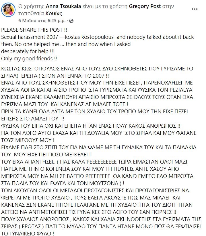 «Κώστας Κωστόπουλος, ένας από τους δυο σκηνοθέτες που γυρίσαμε το σήριαλ «Έρωτας» στον ANT1 το 2007! Ένας από τους σκηνοθέτες που μου την είχε πέσει, παρενοχλήσει με χυδαία λόγια και απαίσιο τρόπο στα γυρίσματα και φυσικά τον ρεζίλευα συνέχεια, έκανε καλαμπούρι απαίσιο μπροστά σε όλους τους όταν είχα γύρισμα μαζί του και κανένας δεν μίλαγε τότε!