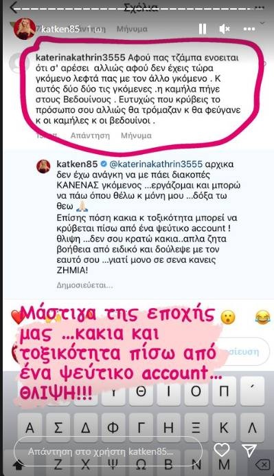 «Αυτή η μάστιγα στης εποχής μας… κακία και τοξικότητα πίσω από ένα ψεύτικο account. Θλίψη!» έγραψε η ίδια κάτω από τη φωτογραφία με το σχόλιο και την απάντησή της η παρουσιάστρια.