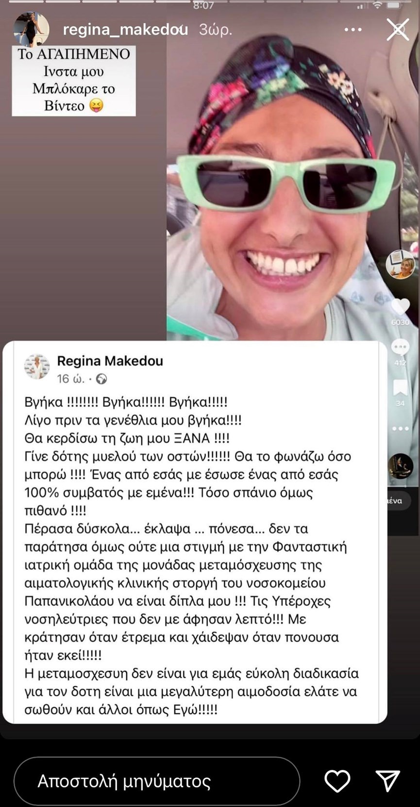 Δεν τα παράτησα όμως ούτε μια στιγμή με την φανταστική ιατρική ομάδα της μονάδας μεταμόσχευσης της αιματολογικής κλινικής στοργή του νοσοκομείου Παπανικολάου να είναι δίπλα μου! Τις υπέροχες νοσηλεύτριες που δεν με άφησαν λεπτό!!! Με κράτησαν όταν έτρεμα και χάιδεψαν όταν πονούσα ήταν εκεί!!! Η μεταμόσχευση δεν είναι για εμάς εύκολη διαδικασία για τον δότη είναι μια μεγαλύτερη αιμοδοσία ελάτε να σωθούν και άλλοι όπως Εγώ!!!!!», έγραψε η Ρεγγίνα Μακέδου.