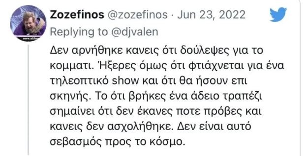 «Παιδιά είναι ένα τηλεοπτικό σόου και όχι κάποιο event σε κλαμπ. Θα προτιμούσα κι εγώ να έχω decks αλλά η δουλειά μου ήταν να μπούμε στούντιο με την αγαπημένη Καίτη Γαρμπή και να φτιάξουμε ένα όμορφο medley που ελπίζω να σας άρεσε. Σας ευχαριστώ».