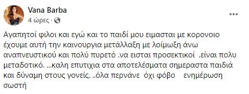 «Αγαπητοί φίλοι και εγώ και το παιδί μου είμαστε με κορονοϊό έχουμε αυτή την καινούργια μετάλλαξη, με λοίμωξη άνω αναπνευστικού και πολύ πυρετό. Να είστε προσεκτικοί .είναι πολύ μεταδοτικό. ...καλή επιτυχία στα αποτελέσματα σήμερα στα παιδιά και δύναμη στους γονείς... όλα περνάνε, όχι φόβο, ενημέρωση σωστή» έγραψε η Βάνα Μπάρμπα.