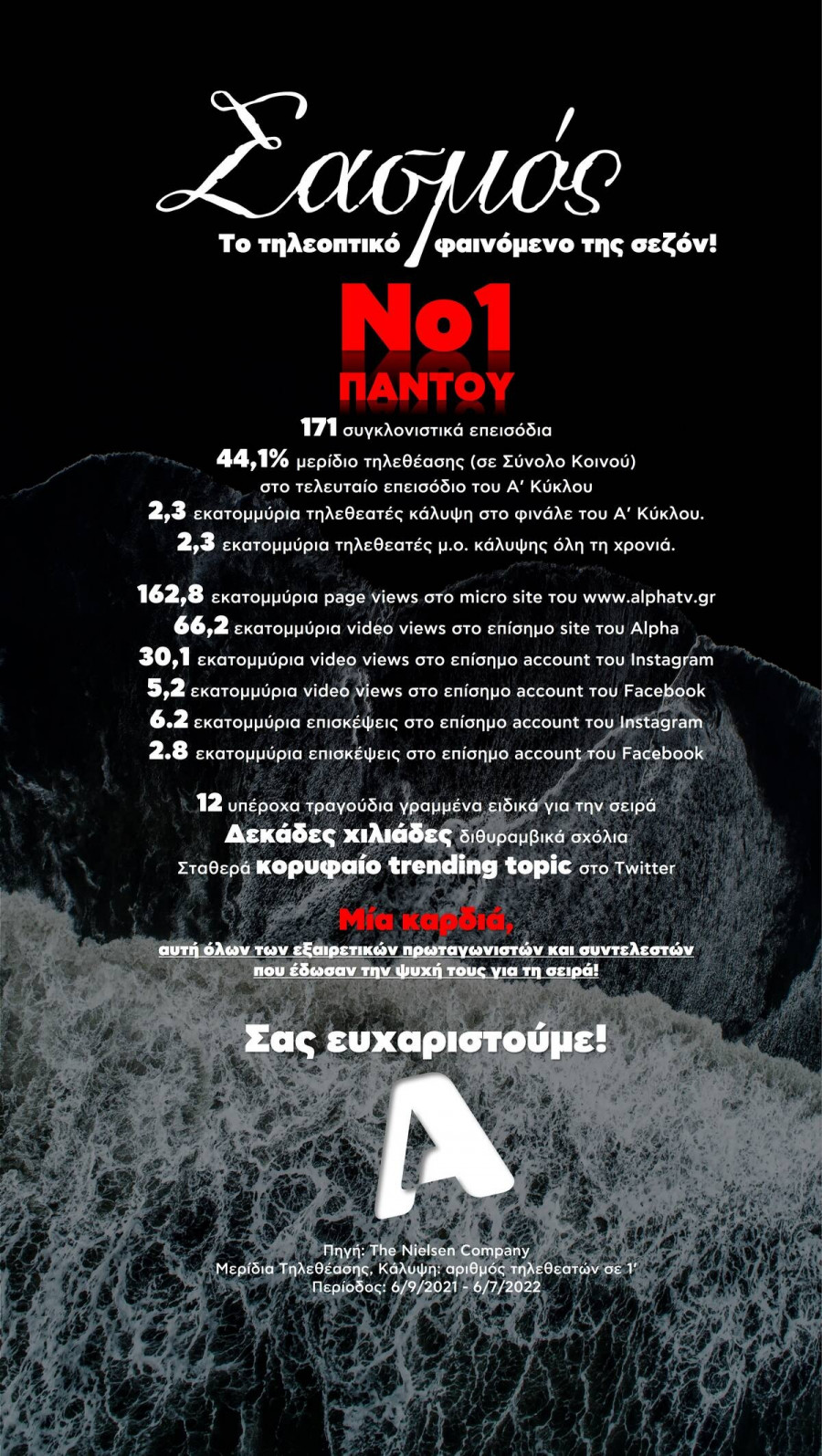 Με δεκάδες χιλιάδες διθυραμβικά σχόλια, ο «Σασμός» αποτέλεσε σταθερά κορυφαίο trending topic στο Twitter μέσα στη σεζόν. Οι αριθμοί που αφορούν τις ιντερνετικές προβολές και τα social media είναι σαρωτικοί!