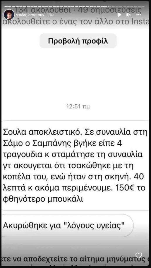 Η instagrammer Σούλα Γκλάμορους ανέβασε τις προηγούμενες ημέρες story στο Instagram, όπου χρήστης της έστειλε ότι ο τραγουδιστής τσακώθηκε με τη σύντροφό του και σταμάτησε τη συναυλία ενώ βρισκόταν στην σκηνή. Ανέφερε επίσης πως τον περίμεναν 40 λεπτά και το φθηνότερο μπουκάλι ήταν 150 ευρώ.