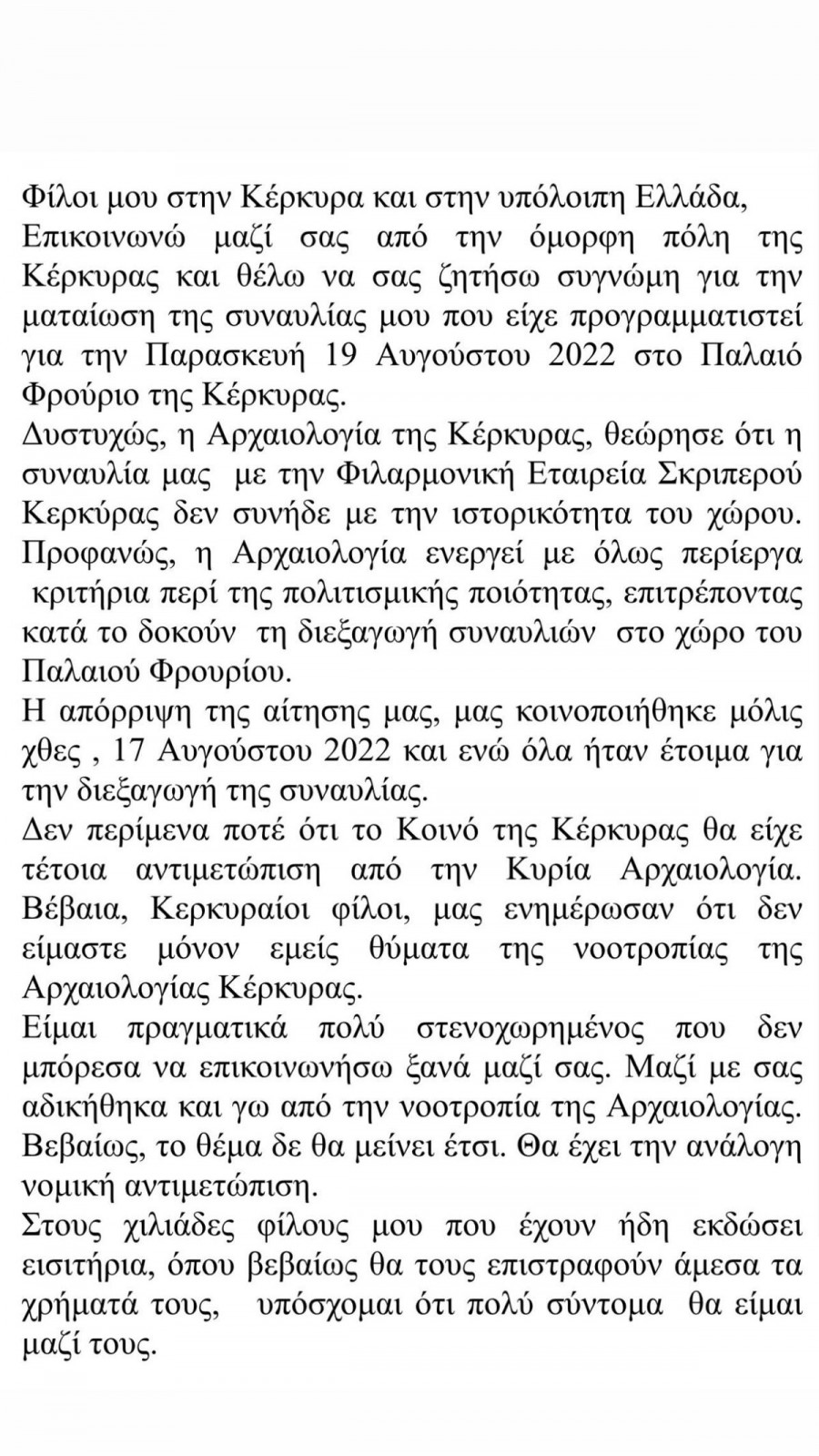 «Φίλοι μου στην Κέρκυρα και στην υπόλοιπη Ελλάδα. Επικοινωνώ μαζί σας από την όμορφη πόλης της Κέρκυρας και θέλω να σας ζητήσω συγγνώμη για τη ματαίωση της συναυλίας μου που είχε προγραμματιστεί για την Παρασκευή 19 Αυγούστου 2022 στο Παλαιό Φρούριο της Κέρκυρας.