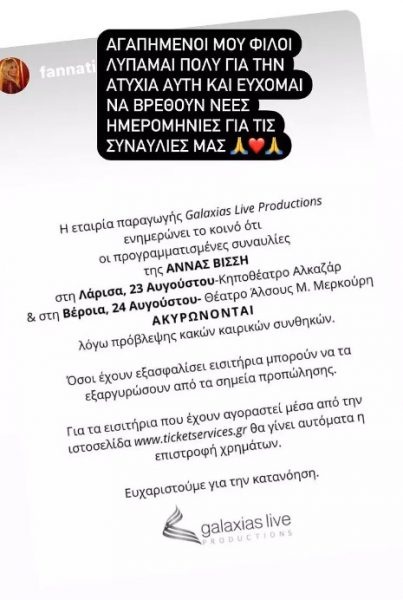 «Η εταιρεία παραγωγής Galaxias Live Production ενημερώνει το κοινό ότι οι προγραμματισμένες συναυλίες της Άννας Βίσση στη Λάρισα 23 Αυγούστου – Κηποθέατρο Αλκαζάρ και στη Βέροια 24 Αυγούστου, Θέατρο Άλσους Μ.Μερκούρη ακυρώνονται λόγω πρόβλεψης κακών καιρικών συνθηκών», αναφέρει η σχετική ανακοίνωση.