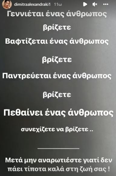 «Γεννιέται ένας άνθρωπος, βρίζετε. Βαφτίζεται ένας άνθρωπος, βρίζετε, παντρεύεται ένας άνθρωπος βρίζετε, πεθαίνει ένα άνθρωπος συνεχίζετε να βρίζετε. Μετά μην αναρωτιέστε γιατί δεν πάει τίποτα καλά στη ζωή σας», έγραψε χαρακτηριστικά η Δήμητρα Αλεξανδράκη.