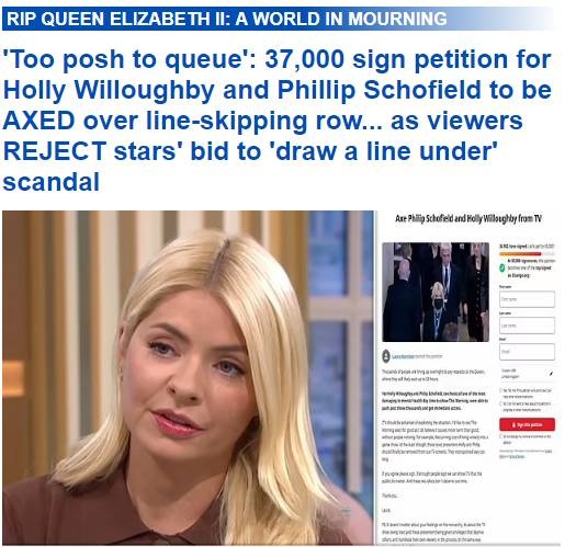 Ο λόγος για τους Holly Willoughby και Phillip Schofield, που παρουσιάζουν την εκπομπή «This Morning» του καναλιού ITV, και όπως γράφτηκε όταν χιλιάδες άνθρωποι περίμεναν υπομονετικά στην ουρά, με τη συνοδεία του προσωπικού ασφαλείας, προσπέρασαν το κοινό για να βρεθούν γρηγορότερα μπροστά στη σορό της βασίλισσας.