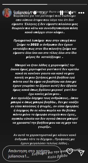 Δε σχολιάζω άσχημα τους ανθρώπους, όπου μπορώ και όπως μπορώ βοηθάω, δε με νοιάζει αν είσαι πλούσιος ή φτωχός, αν είσαι όμορφος ή άσχημος, θα σε κάνω παρέα και θα βλέπω πάντα μόνο τα όμορφα στοιχεία που έχεις, αγαπώ εύκολα και δεν αγνοώ όποιον μπορεί να χρειαστεί τη βοήθειά μου και ας μην τον γνωρίζω. Αν αυτά τα χαρακτηριστικά με κάνουν κακό άνθρωπο, τότε το δέχομαι. Προφανώς με έχουν μεγαλώσει τελείως λάθος. Συγγνώμη για την αναστάτωση» έγραψε η Τζούλια Νόβα στο Instagram.