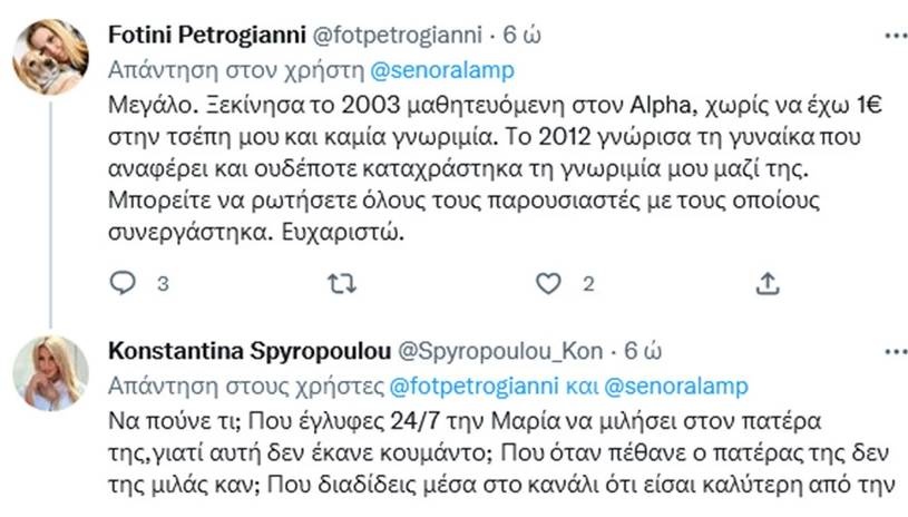 Με τη σειρά της η Φωτεινή Πετρόγιαννη έγραψε: «Μεγάλο. Ξεκίνησα το 2003 μαθητευόμενη στον Alpha, χωρίς να έχω 1 ευρώ στην τσέπη μου και καμία γνωριμία. Το 2012 γνώρισα τη γυναίκα που αναφέρει και ουδέποτε καταχράστηκα τη γνωριμία μου μαζί της. Μπορείτε να ρωτήσετε όλους τους παρουσιαστές με τους οποίους συνεργάστηκα. Ευχαριστώ».