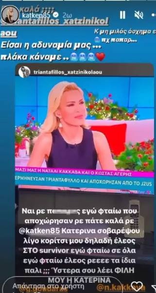 Η Κατερίνα Καινούργιου αναδημοσίευσε το story του Τριαντάφυλλου, λέγοντας το εξής: «Πας καλά Τριαντάφυλλε; Είσαι η αδυναμία μας, πλάκα κάνουμε και μη μιλάς άσχημα εδώ».
