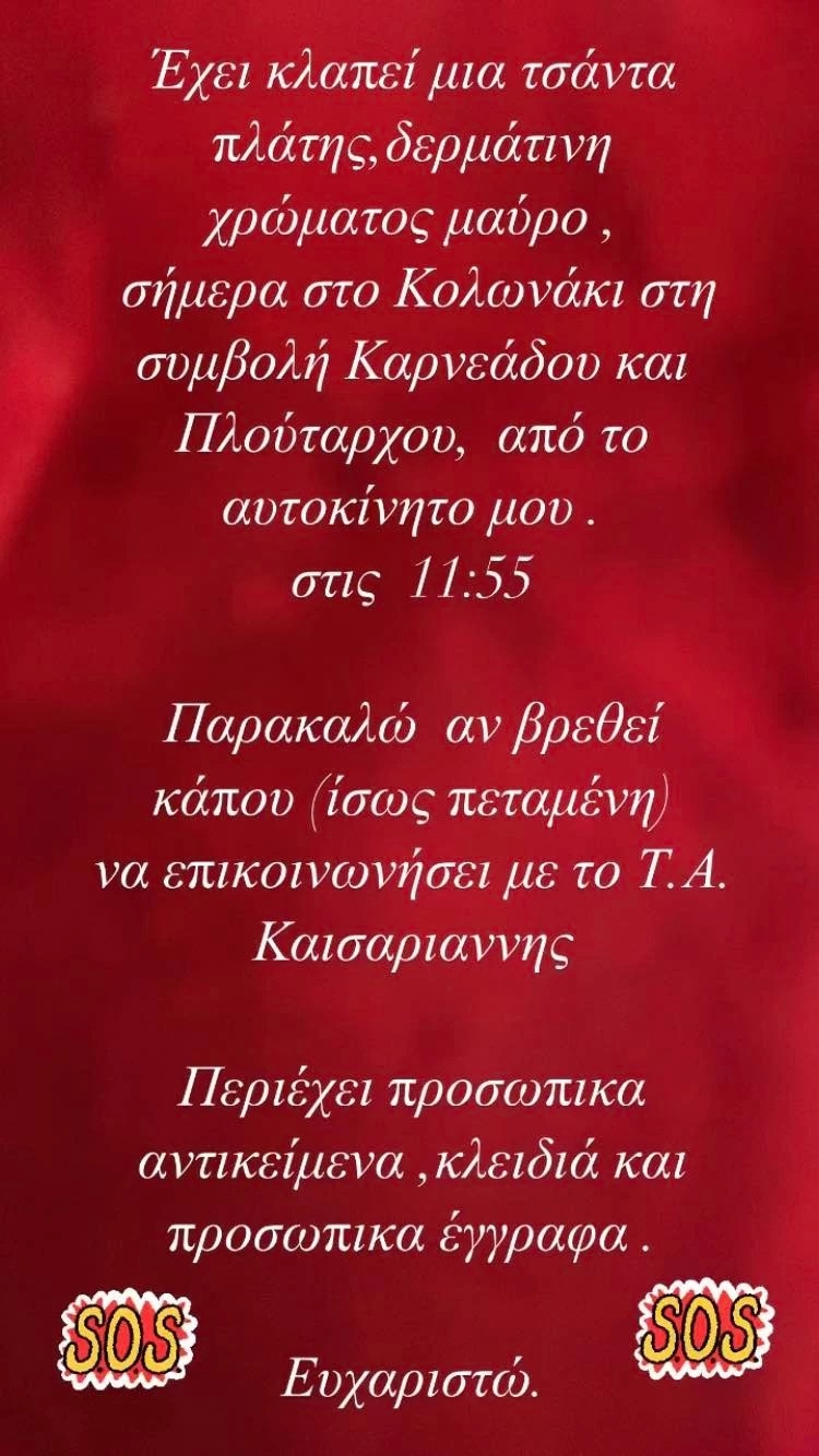 «Έχει κλαπεί μια τσάντα πλάτης, δερμάτινη χρώματος μαύρο, σήμερα στο Κολωνάκι στη συμβολή Καρνεάδου και Πλούταρχου, από το αυτοκίνητό μου στις 11.55. Παρακαλώ αν βρεθεί κάπου (ίσως πεταμένη) να επικοινωνήσει με το Τ.Α. Καισαιριανής. Περιέχει προσωπικά αντικείμενα, κλειδιά και προσωπικά έγγραφα. Ευχαριστώ».