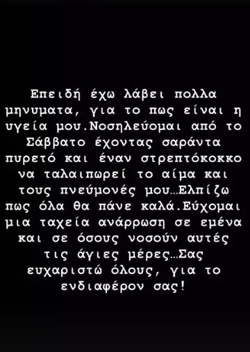 Συγκεκριμένα, νοσηλεύεται στο νοσοκομείο και από εκεί ενημέρωσε τους διαδικτυακούς του φίλους για την πορεία της υγείας.