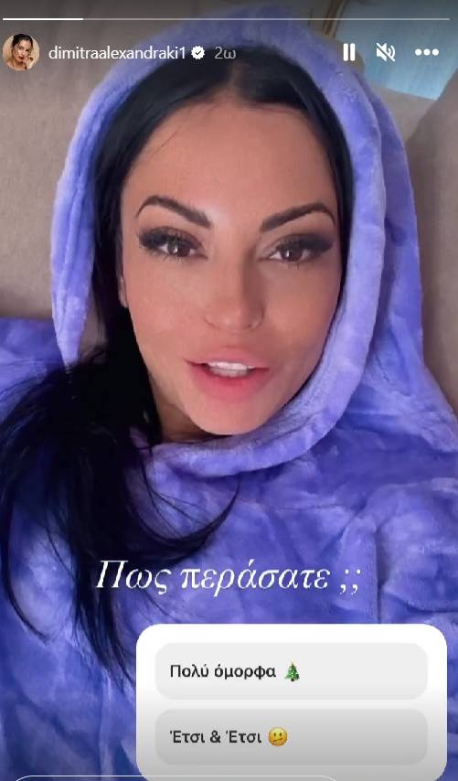 Σήμερα 26/12 η ίδια ανέβασε στο Instagram ένα στόρι στο οποίο έκανε γνωστό ότι απουσίαζε, αλλά όμως πέρασε πολύ ωραία και ηρέμησε. «Είχαμε πάει και μείναμε σε ένα μοναστήρι, περάσαμε πολύ όμορφα, αλλά όλα καλά, γι' αυτό ήμουν εξαφανισμένη. Πως τα περάσατε;» είπε η Δήμητρα Αλεξανδράκη.