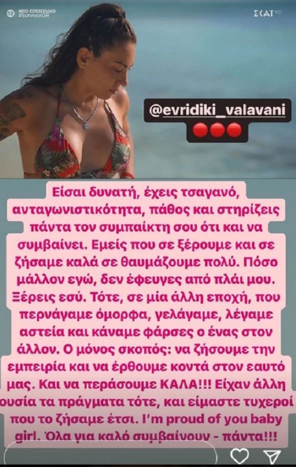 «Είσαι δυνατή, έχεις τσαγανό, ανταγωνιστικότητα, πάθος και στηρίζεις πάντα τον συμπαίκτη σου ό,τι και να συμβαίνει. Εμείς που σε ξέρουμε και σε ζήσαμε καλά σε θαυμάζουμε πολύ. Πόσο μάλλον εγώ, δεν έφευγες από το πλάι μου. Ξέρεις εσύ. Τότε, σε μία άλλη εποχή, που περνάγαμε όμορφα, γελάγαμε, λέγαμε αστεία και κάναμε φάρσες ο ένας στον άλλον. Ο μόνος σκοπός; Να ζήσουμε την εμπειρία και να έρθουμε κοντά στον εαυτό μας. Και να περάσουμε καλά!!! Είχαν άλλη ουσία τα πράγματα τότε και είμαστε τυχεροί που το ζήσαμε έτσι. I’m proud of you girl. Όλα για καλό συμβαίνουν, πάντα» έγραψε στο instastory της.