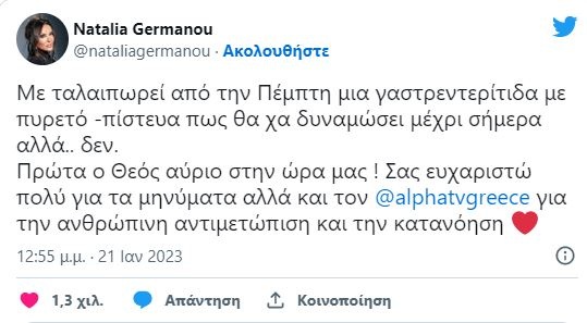 Η Ναταλία Γερμανού, μάλιστα, έγραψε στο Twitter της «με ταλαιπωρεί από την Πέμπτη μια γαστρεντερίτιδα με πυρετό -πίστευα πως θα χα δυναμώσει μέχρι σήμερα αλλά.. δεν. Πρώτα ο Θεός αύριο στην ώρα μας ! Σας ευχαριστώ πολύ για τα μηνύματα αλλά και τον @alphatvgreece για την ανθρώπινη αντιμετώπιση και την κατανόηση».