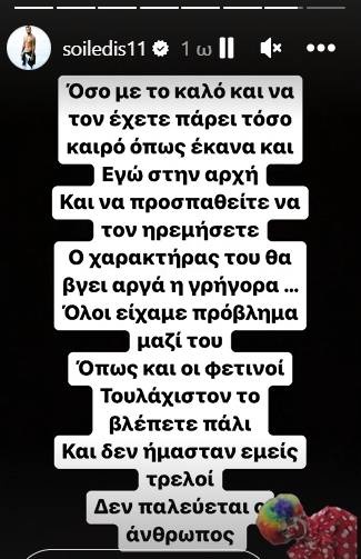 Με αφορμή λοιπόν τον άγριο καυγά του Τάκη Καραγκούνια με τους συμπαίκτες του, ο Άρης Σοϊλέδης δημοσίευσε ένα story στο Instagram εκτοξεύοντας «πυρά» στον Τάκη Καραγκούνια.