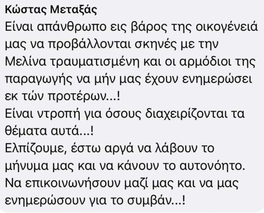 «Είναι απάνθρωπο εις βάρος της οικογένειάς μας να προβάλλονται σκηνές με τη Μελίνα τραυματισμένη και οι αρμόδιοι της παραγωγής να μην μας έχουν ενημερώσει εκ των προτέρων. Είναι ντροπή για όσους διαχειρίζονται τα θέματα αυτά. Ελπίζουμε, έστω αργά να λάβουν το μήνυμά μας και να κάνουν το αυτονόητο. Να επικοινωνήσουν μαζί μας και να μας ενημερώσουν για το συμβάν», έγραψε ο πατέρας της.