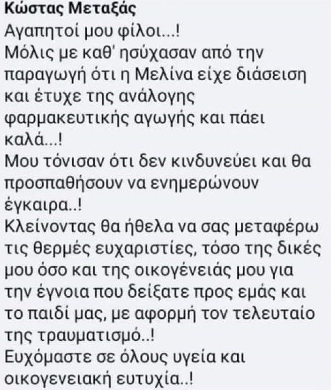 «Αγαπητοί μου φίλοι, μόλις με καθησύχασαν από την παραγωγή ότι η Μελίνα είχε διάσειση και έτυχε της ανάλογης φαρμακευτικής αγωγής και πάει καλά. Μου τόνισαν ότι δεν κινδυνεύει και θα προσπαθήσουν να ενημερώνουν έγκαιρα. Κλείνοντας θα ήθελα να σας μεταφέρω τις θερμές ευχαριστίες, τόσο τις δικές μου, όσο και της οικογένειάς μου για την έγνοια που δείξατε προς εμάς και το παιδί μας, με αφορμή τον τελευταίο της τραυματισμό. Ευχόμαστε σε όλους υγεία και οικογενειακή ευτυχία», έγραψε ο πατέρας της παίκτριας των Μαχητών.