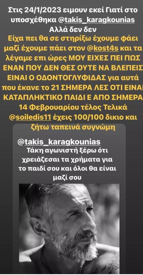 Συγκεκριμένα, μέσα από δυο ιστορίες στον προσωπικό του λογαριασμό στο Instagram, ο Τριαντάφυλλος ξεκαθάρισε πως δεν πρόκειται να στηρίξει στο εξής ξανά τον μισθοφόρο του Survivor All Star εξηγώντας και τους λόγους. «Στις 24/1/2023 ήμουν εκεί γιατί στο υποσθέχηκα, Τάκη. Αλλά δεν είχα πει θα σε στηρίξω. Έχουμε φάει μαζί, έχουμε πάει στον Κώστα Αναγνωστόπουλο και τα λέγαμε επί ώρες. Μου είπες πει πως έναν που δεν θες ούτε να βλέπεις είναι ο οδοντογλυφίδας για αυτά που έκανε το ’21».