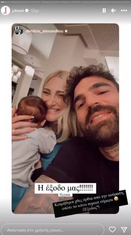 Το ζευγάρι που δείχνει να είναι ξετρελαμένο με τον γιο του, δημοσιεύει αρκετές φορές στιγμιότυπα από την καθημερινότητά τους. Το βράδυ της Τετάρτης, η Ιωάννα Τούνη με τον Δημήτρη Αλεξάνδρου και τον 1,5 μήνα γιο του απόλαυσαν μια οικογενειακή έξοδο και φυσικά έβγαλαν και την ανάλογη οικογενειακή φωτογραφία την οποία η Ιωάννα Τούνη μοιράστηκε με τους ακόλουθούς της στο instagram.