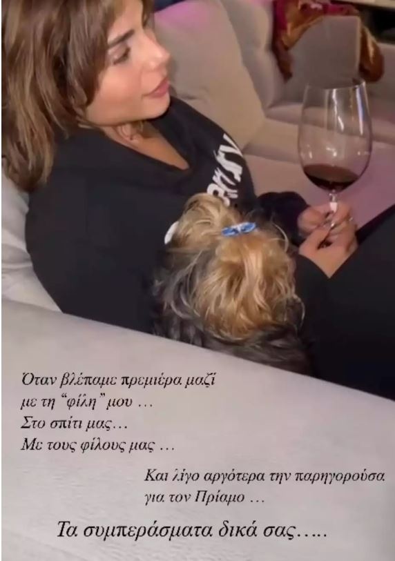 «Όταν βλέπαμε πρεμιέρα μαζί με τη “φίλη” μου… Στο σπίτι μας… Με τους φίλους μας… Και λίγο αργότερα την παρηγορούσα για τον Πρίαμο… Τα συμπεράσματα δικά σας» έγραψε χαρακτηριστικά η Αλεξάνδρα Παναγιώταρου.