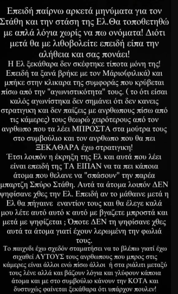 «Επειδή παίρνω αρκετά μηνύματα για τον Στάθη και τη στάση της Ελευθερίας θα τοποθετηθώ με απλά λόγια, χωρίς να πω ονόματα. Διότι μετά θα με λιθοβολείτε επειδή είπα την αλήθεια και σας πονάει. Η Ελευθερία ξεκάθαρα δε σκέφτηκε τίποτα μόνη της.