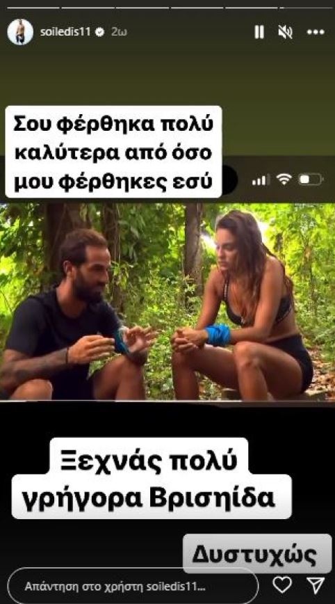 Θέλοντας να τοποθετηθεί σχετικά με όσα ακούστηκαν γύρω από το όνομά του, ο Άρης Σοϊλέδης δημοσίευσε σε story δύο στιγμιότυπα από τη συνέντευξη της Ευρυδίκης και σχολίασε: «Σου φέρθηκα πολύ καλύτερα από όσο μου φέρθηκες εσύ. Ξεχνάς πολύ γρήγορα Βρισηίδα. Δυστυχώς».