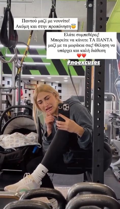 «Παντού μαζί με νουνίτο. Ακόμα και στην προπόνηση. Ελάτε συμπεθέρες, μπορείτε να κάνετε τα πάντα μαζί με τα μωράκια σας. Θέληση να υπάρχει και καλή διάθεση» έγραψε στο story της η Ιωάννα Τούνη.